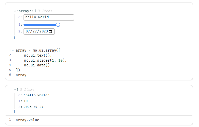 Arrays and dictionaries. Use mo.ui.array and mo.ui.dictionary to logically group together related elements. These elements are especially useful when a set of UI elements is only known at runtime (so you can't assign each to a global variable individually, but can assign them to an array or dictionary).